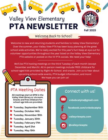All PTA meetings start at 6 PM in the Valley View Elementary library or online via ZOOM. Snacks and childcare for school-aged kids are provided.